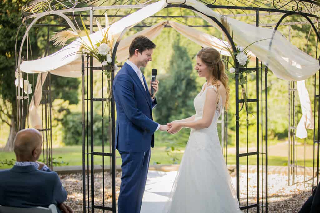 Yvon maakte de ceremonie bijzonder door mooie verhalen van onze vrienden en familie over ons erin te verwerken. Wat kregen we veel positieve reacties van onze gasten! Ze waren allemaal fan van de warme en attente persoonlijkheid van Yvon.
